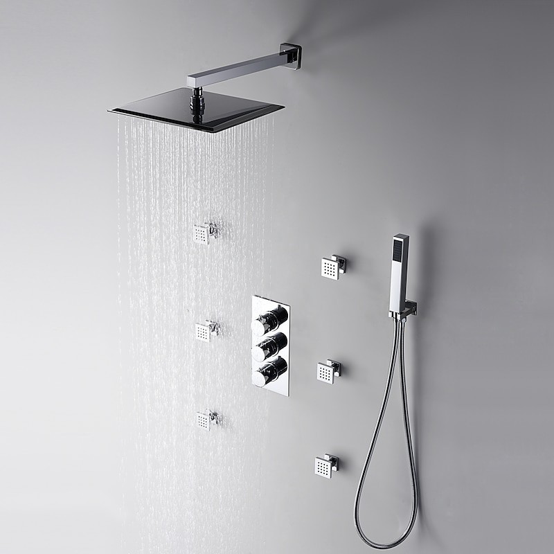 Style:Contemporary,Features:Rainfall,Faucet Type:Shower Set,Installation Type:Wall Mounted,Number Of Handles:Three Handles,Flow Rate (L/min):4.4 Gal/min,Cold and Hot Switch:Yes,Valve Type:Brass Valve,Finish:Chrome,Installation Holes and Handles:Three Handles Three Holes,