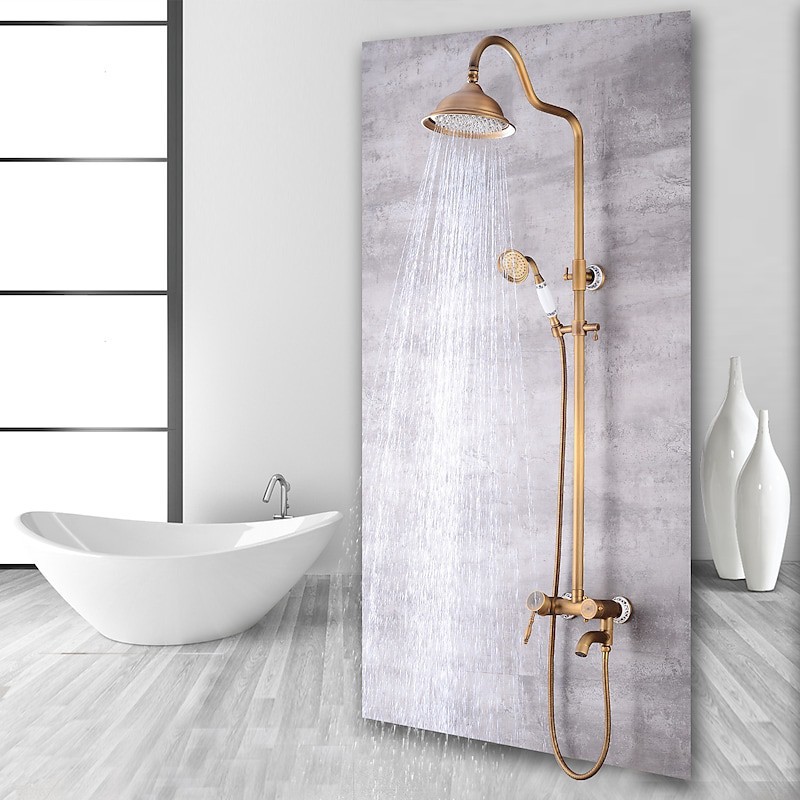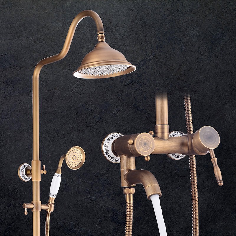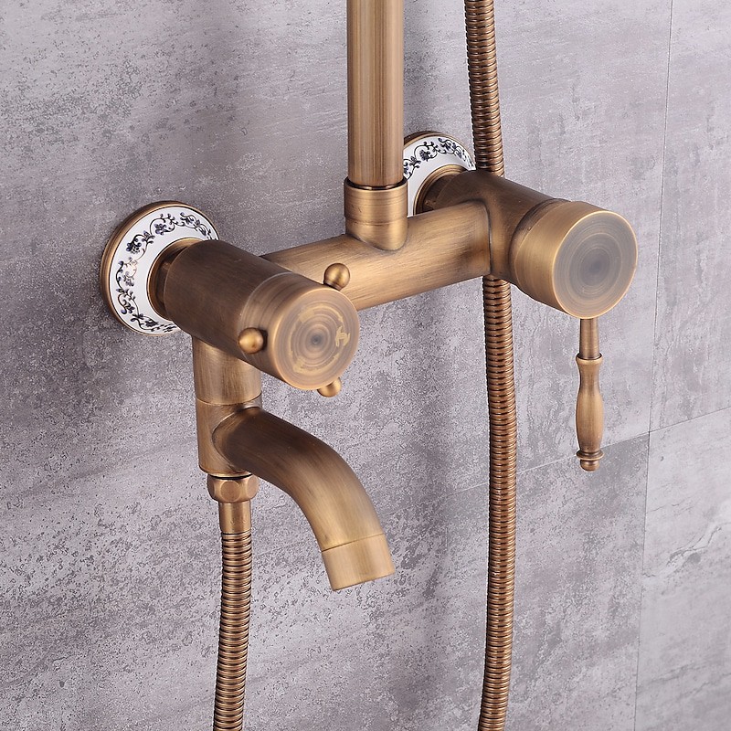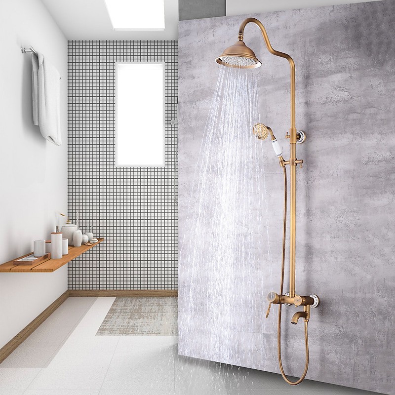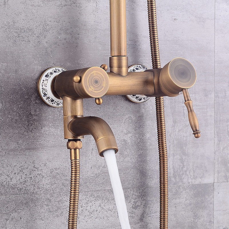 Style:Vintage Style,Country,Features:pullout,Handshower Included,Waterfall,Faucet Type:Shower System,Installation Type:Mount Outside,Cold and Hot Switch:Yes,Valve Type:Ceramic Valve,Finish:Antique Brass,