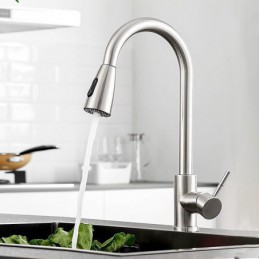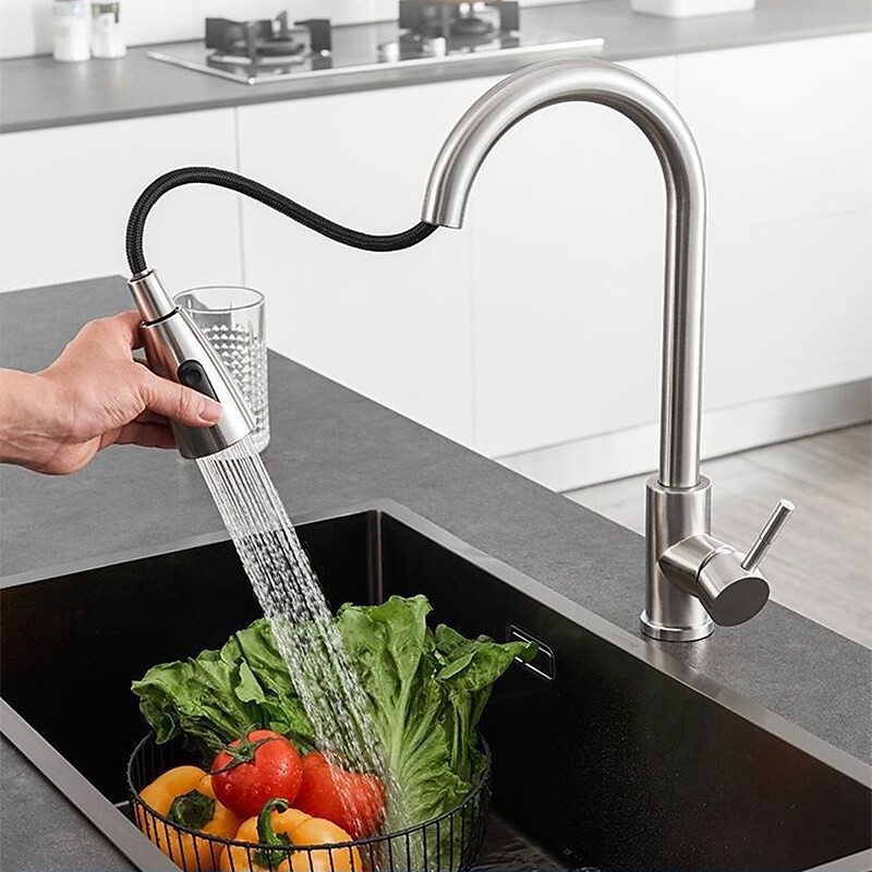 Type:Standard Spout,Pull-out/Pull-down,Tall/High Arc,Style:Minimalist,Modern Contemporary,Features:Rotatable,Multi-function,Pull out,Faucet Type:Kitchen faucet,Installation Type:Centerset,Cold and Hot Switch:Yes,Valve Type:Ceramic Valve,Finish:Stainless Steel,Installation Holes and Handles:Single Handle One Hole,Water Pressure (Mpa):0.2-1,